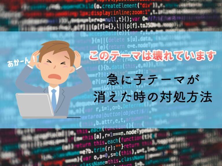 このように「子テーマ」が急に消えてしまったり、「このテーマは壊れています」と表記されるシチュエーションは、主に「テーマのアップロード中や後」に多いです。