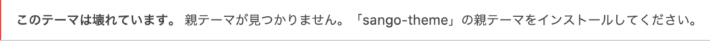 というように【このテーマは壊れています。親テーマが見つかりません。「sango-theme」の親テーマをインストールしてください。】というような、怖い表記がなされています。